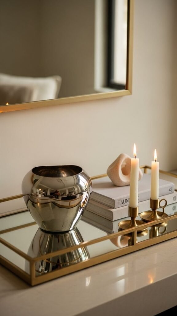 Set a mirrored tray down to instantly amplify a mantel vignette—you’ll catch light, multiply textures, and give small objects a luxe stage.