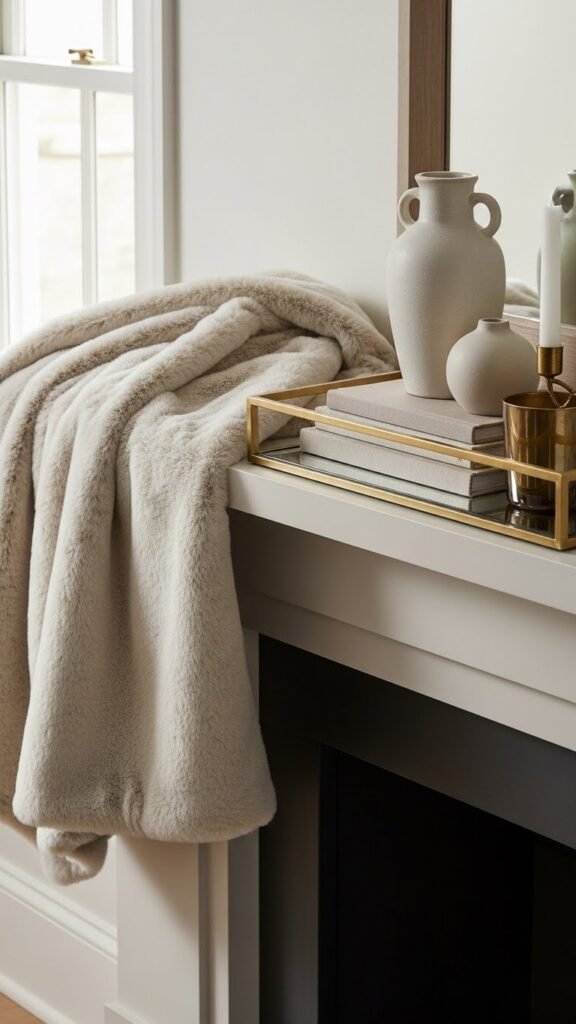 After the gleam of a mirrored tray, soften the scene with a folded faux fur throw to add tactile warmth and a luxe-but-playful contrast. You’ll place it casually at one mantle end, inviting touch and framing artful objects. The cozy texture anchors layered neutrals, creating a free-spirited, chic pause that reads intentional without feeling staged.