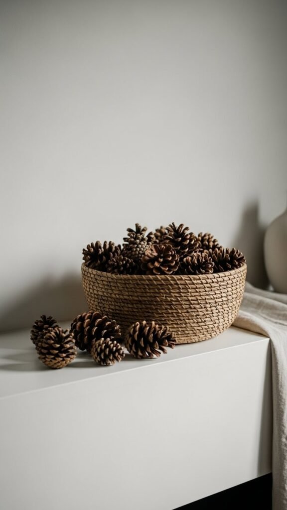 A woven basket filled with pinecones brings organic texture and seasonal charm to your mantle, offering an effortless focal point that reads both curated and casual. You’ll place a woven grouping off-center, letting textured pinecones spill artfully. Keep tones neutral, mix sizes for depth, and leave negative space around the basket so your mantle breathes—minimal, free, and unmistakably modern.