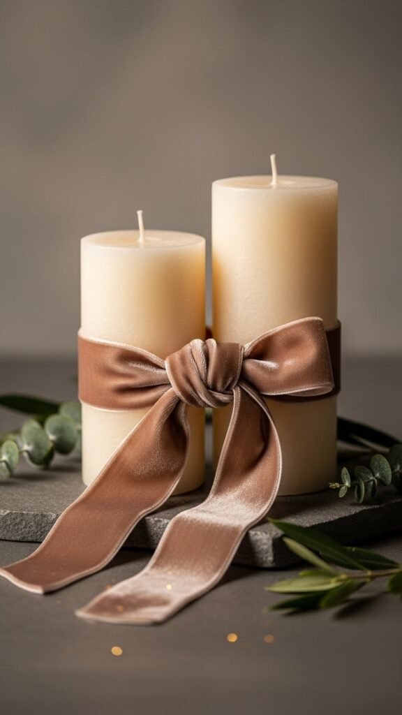 Often you’ll lean into velvet-ribboned pillar candles when you want an instant luxe accent that still feels cozy; wrap a single wide velvet band around one or two varying-height pillars, knot it off-center, and let the soft pile catch light for tactile contrast against matte paint or stone.