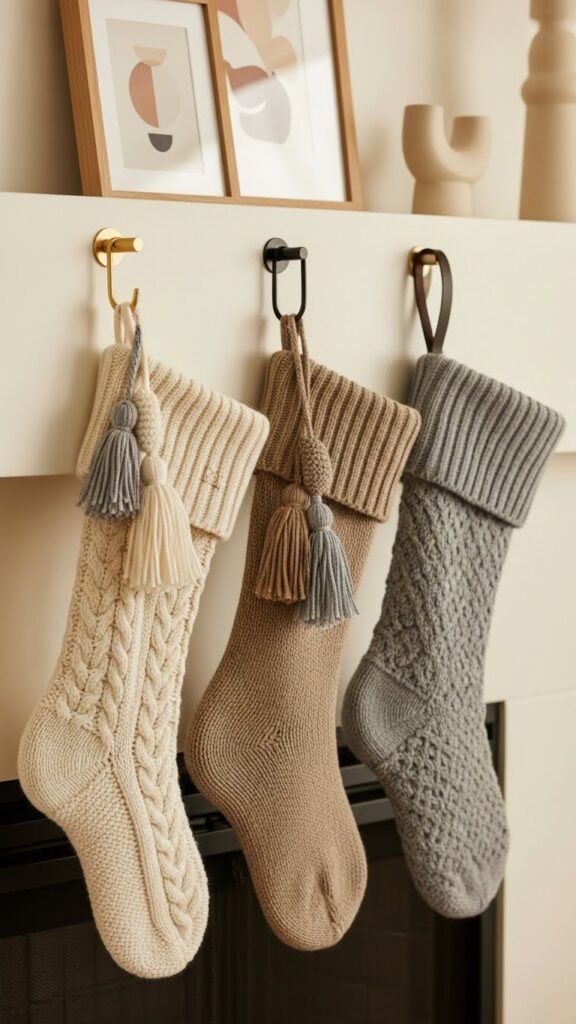 Bring knitted stockings into view as an effortless way to add texture and seasonal charm to your mantel; choose chunky cable knits or fine merino weaves in a restrained palette, then hang them with mixed-metal hooks or leather loops to keep the look modern and tailored.