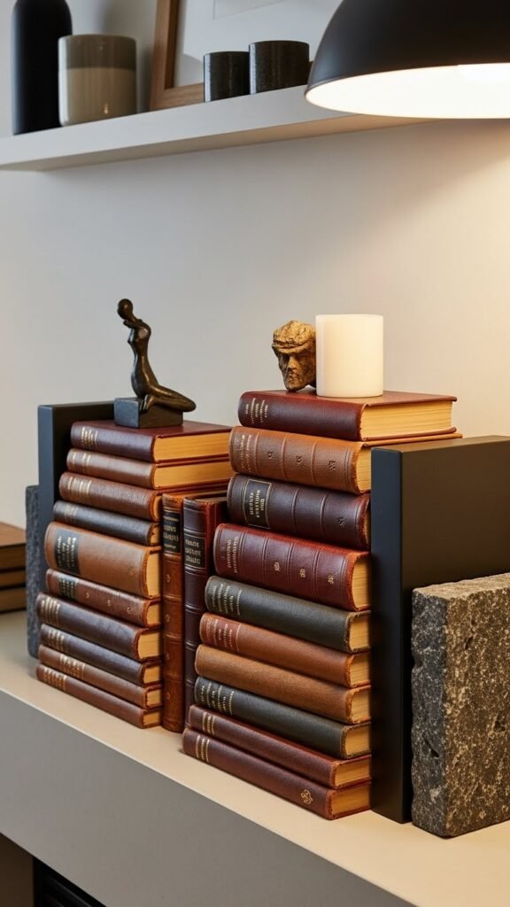 Stack a few leather-bound books horizontally to anchor your mantel with quiet, classic polish that still reads modern. You’ll place vintage leather volumes in varied tones, topped with a small sculptural object or candle.