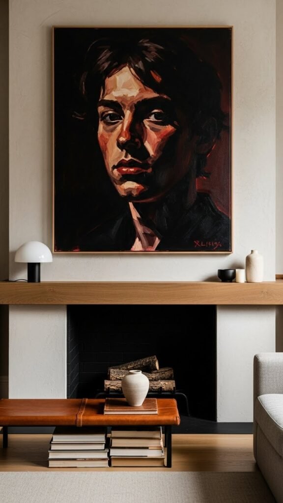 Choose an oversized portrait with bold brushwork and moody lighting to set tone.