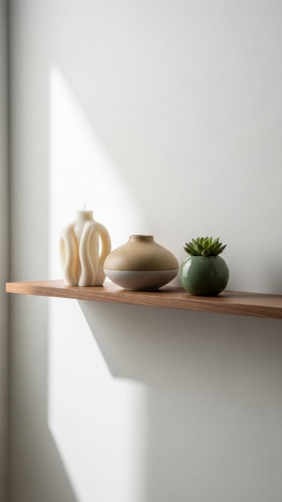 Move the eye from one confident object to a curated trio on a slim floating shelf, where rhythm and restraint meet modern grammar. You’ll hang a wood ledge low, then style a trio arrangement: a sculpted candle, a low ceramic, a tiny planter. That minimalist grouping gives airy balance, a sheltering pause that feels deliberate, fresh, and utterly free.