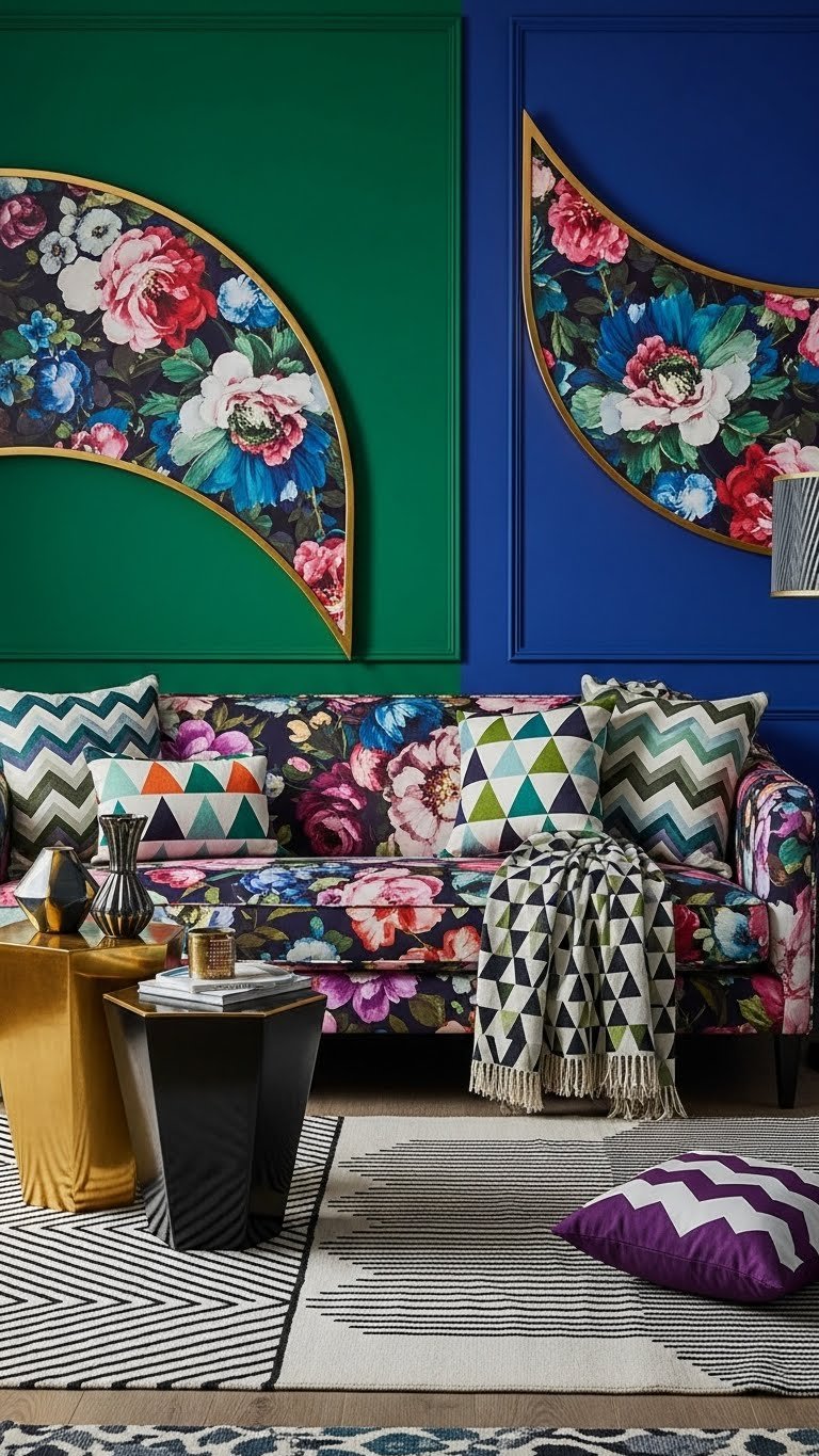 Once you’ve layered jewel tones, push the look further by pairing oversized florals with crisp geometrics—contrasting organic curves against sharp angles keeps the eye moving and the room energized.