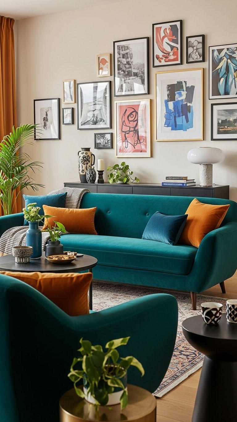 After your gallery wall sets the room’s conversational tone, anchor the space with a plush statement sofa that both grounds and elevates your eclectic mix.