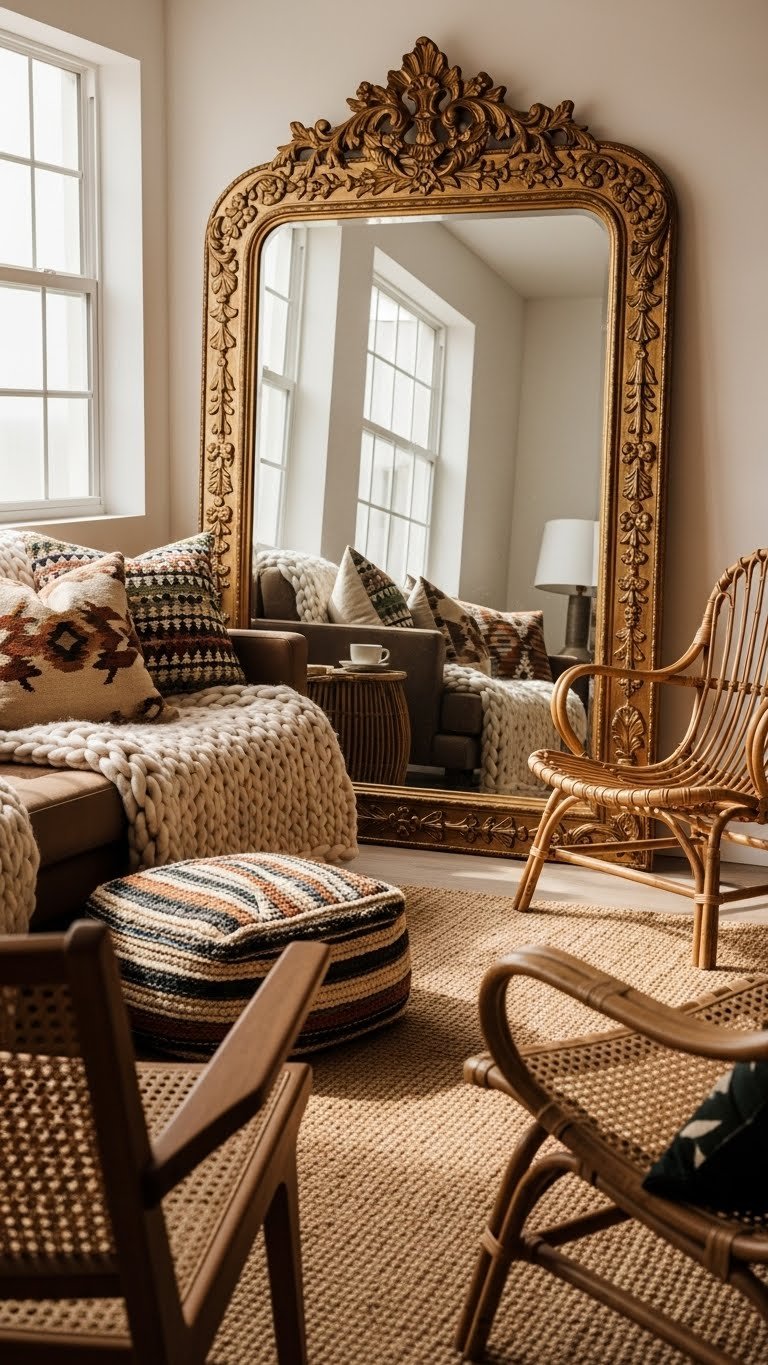 Pairing heavy textiles and natural weaves sets the perfect stage for a statement mirror to amplify that layered effect — an oversized mirror with an ornate frame will reflect and multiply your textures, color, and light so the room reads larger and more intentional.