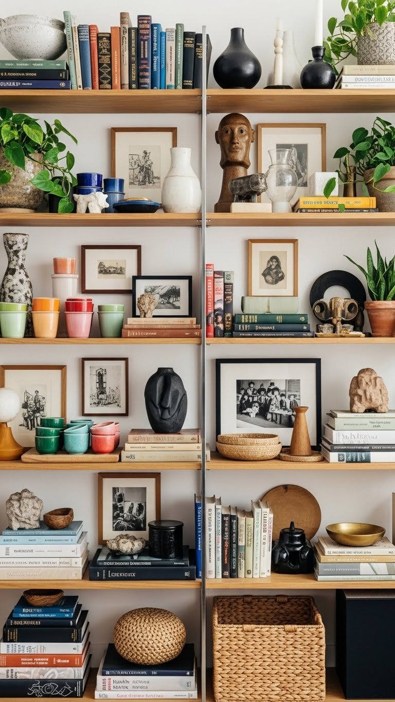 Curate miniature sculptures and layered themed vignettes that celebrate travel, art or whimsy; mix heights, textures and bold pieces so the display feels joyful, intentional and unapologetically you.