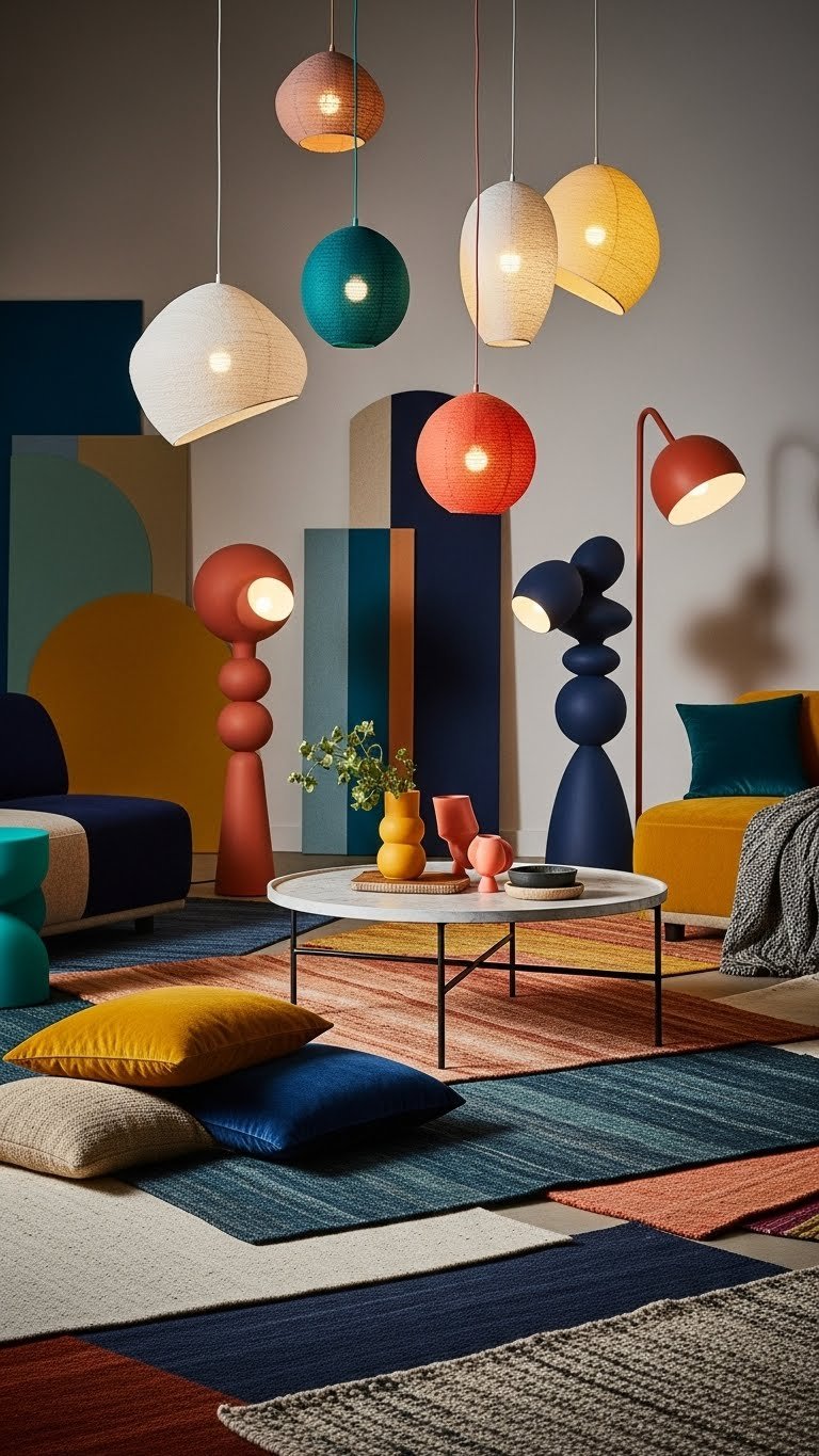 Those layered rugs set a lively stage, so bring in lighting that answers their energy—playful, sculptural fixtures will turn ceiling and table space into another expressive surface. You’ll choose Playful pendants to float color and form, and Sculptural floorlights to ground drama.