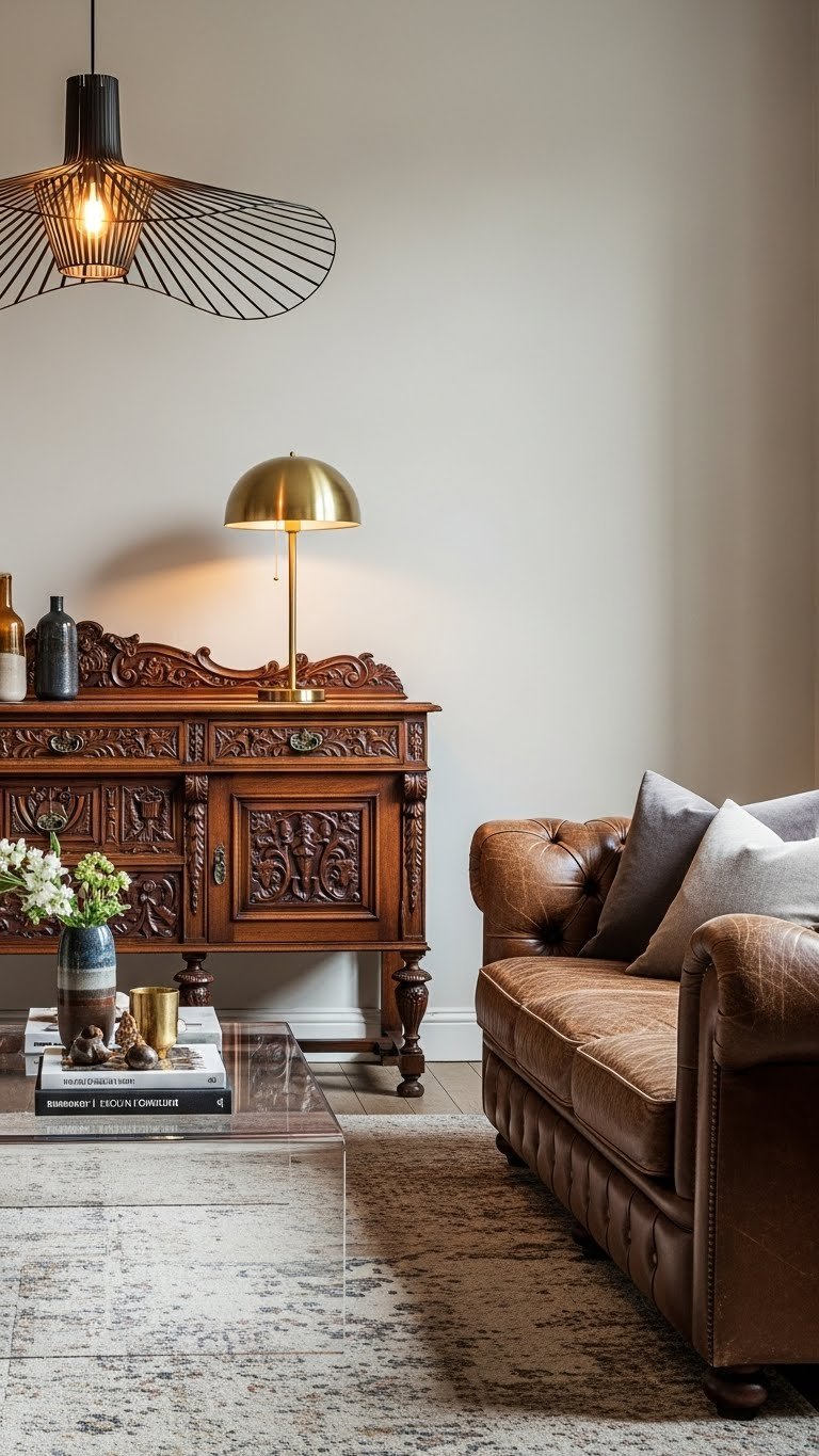 If you lean into contrast, antique pieces become anchors that give modern accents depth and personality—pair a carved Victorian sideboard with a sleek brass lamp or set a worn leather Chesterfield against a streamlined acrylic coffee table to make each element sing. You’ll mix antique silhouettes with modern hardware, celebrate patina finishes, and add bold lighting to free your space and assert confident, eclectic style.
