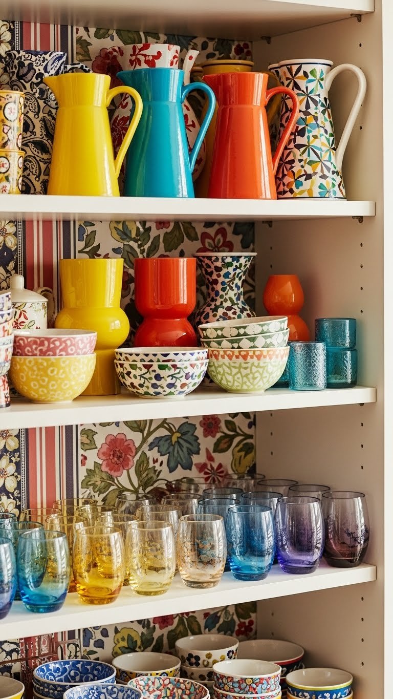 Bring in colorful ceramic and glassware to punctuate your maximalist scheme and watch the room sing—these tactile pieces add instant personality, reflect light, and bridge disparate patterns. You’ll layer vibrant pitchers on open shelving, mix sculptural vases with functional bowls, and display mouthblown tumblers to catch glare and color. Trust bold, curated collections to free your aesthetic and energize every corner.