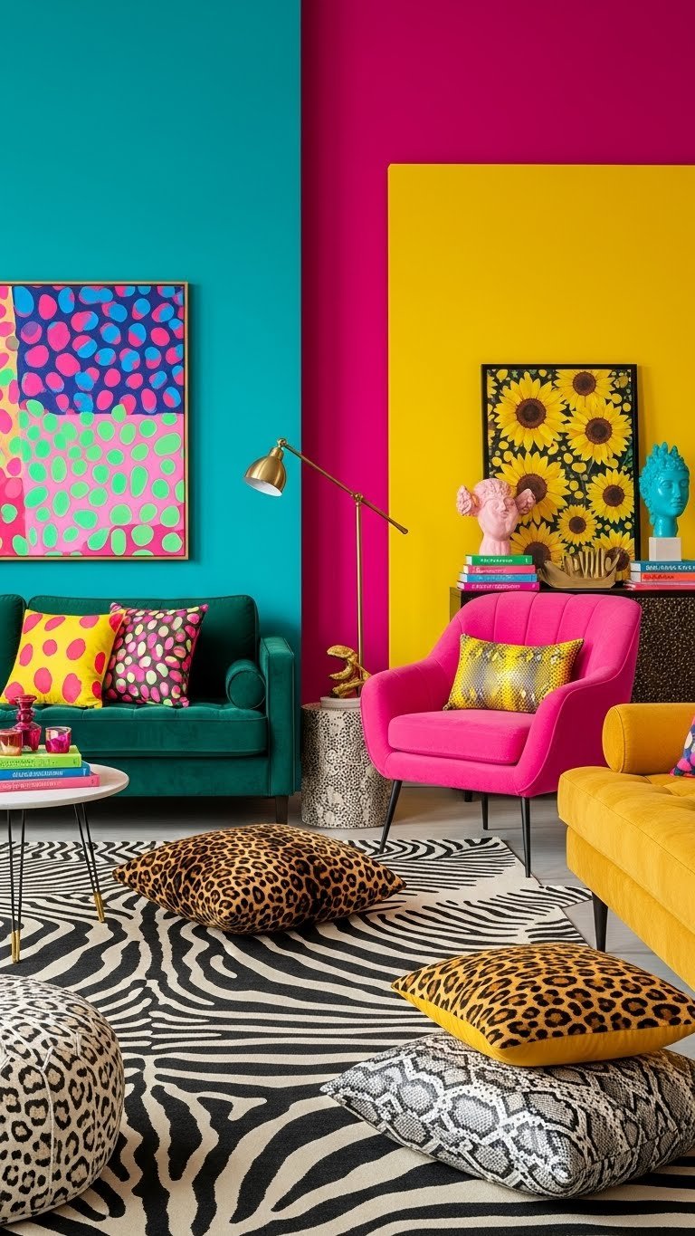 Layer animal prints into your scheme and pair them with bright solids to create a confident, modern maximalist statement. You’ll mix Safari stripes with bold color blocks and sprinkle Neon spots as accents on pillows or art.