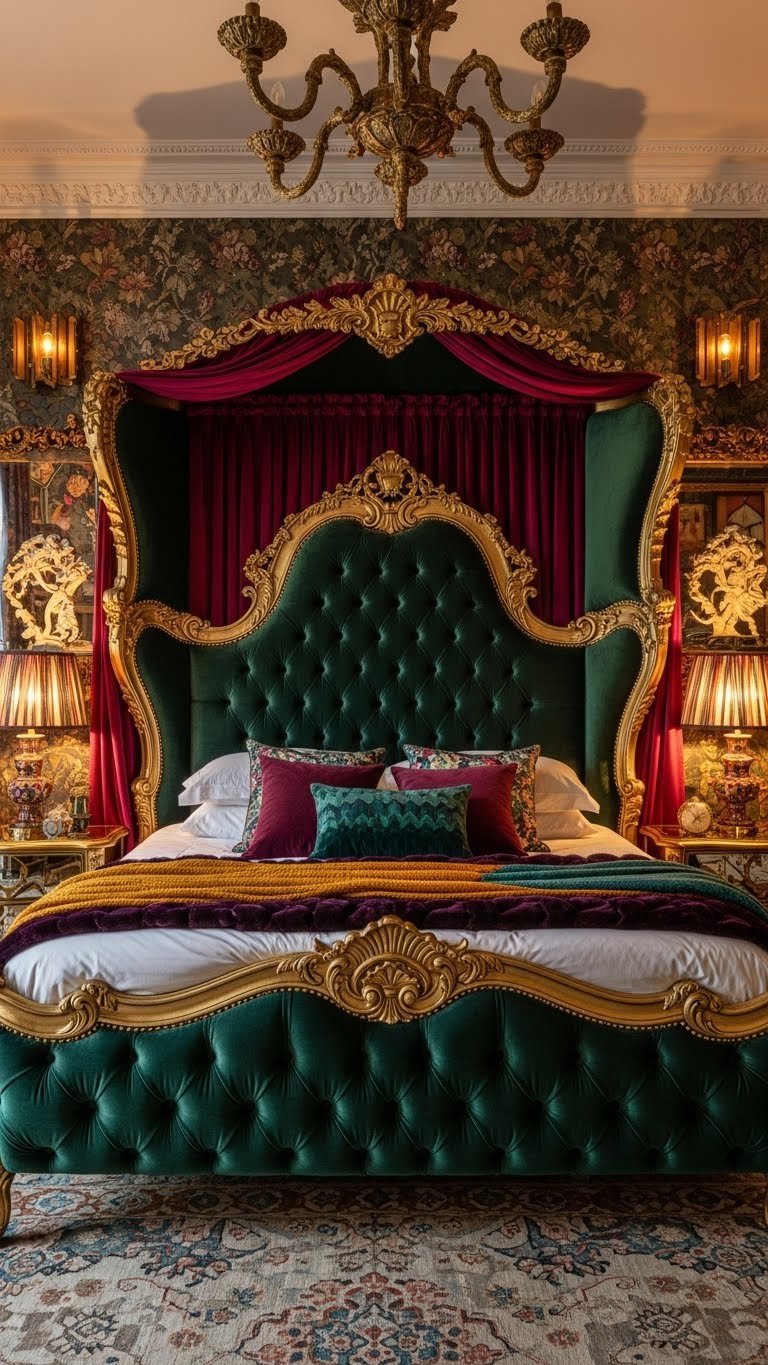 Choose ornate headboards or oversized silhouettes to declare your freedom — carved details, gilt edges, or bold upholstery add instant personality. Embrace tufted drama for texture and comfort, layer with eclectic lighting, and let the headboard dictate color, scale, and unapologetic style.