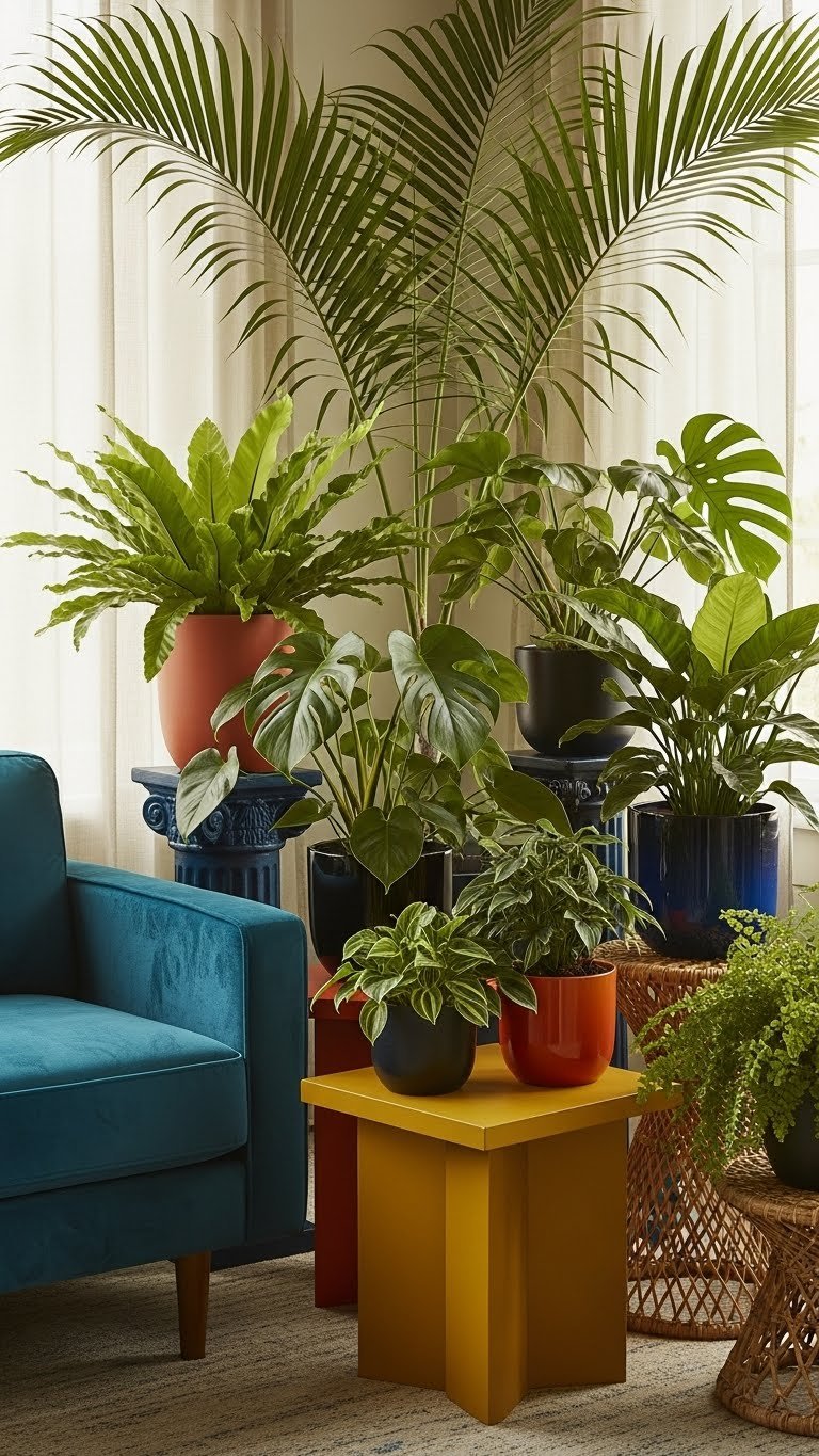 You’ll place towering indoor palms for vertical drama and group textured ferns for tactile depth, choosing bold pots and confident placement so greenery reads like art—freeing your space with abundant, intentional life.