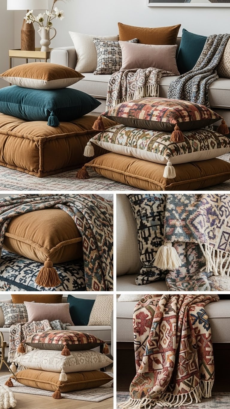 Pile on cushions and throws with intention so each piece reads like a curated accent rather than clutter—mix oversized floor cushions, sculptural bolsters, and a few richly patterned pillows in varied scales to create depth and movement across your seating. You’ll pair velvet bolsters with layered lumbar options, add patterned throws and plush tassels, and confidently mix color and texture for a liberated, artful look.