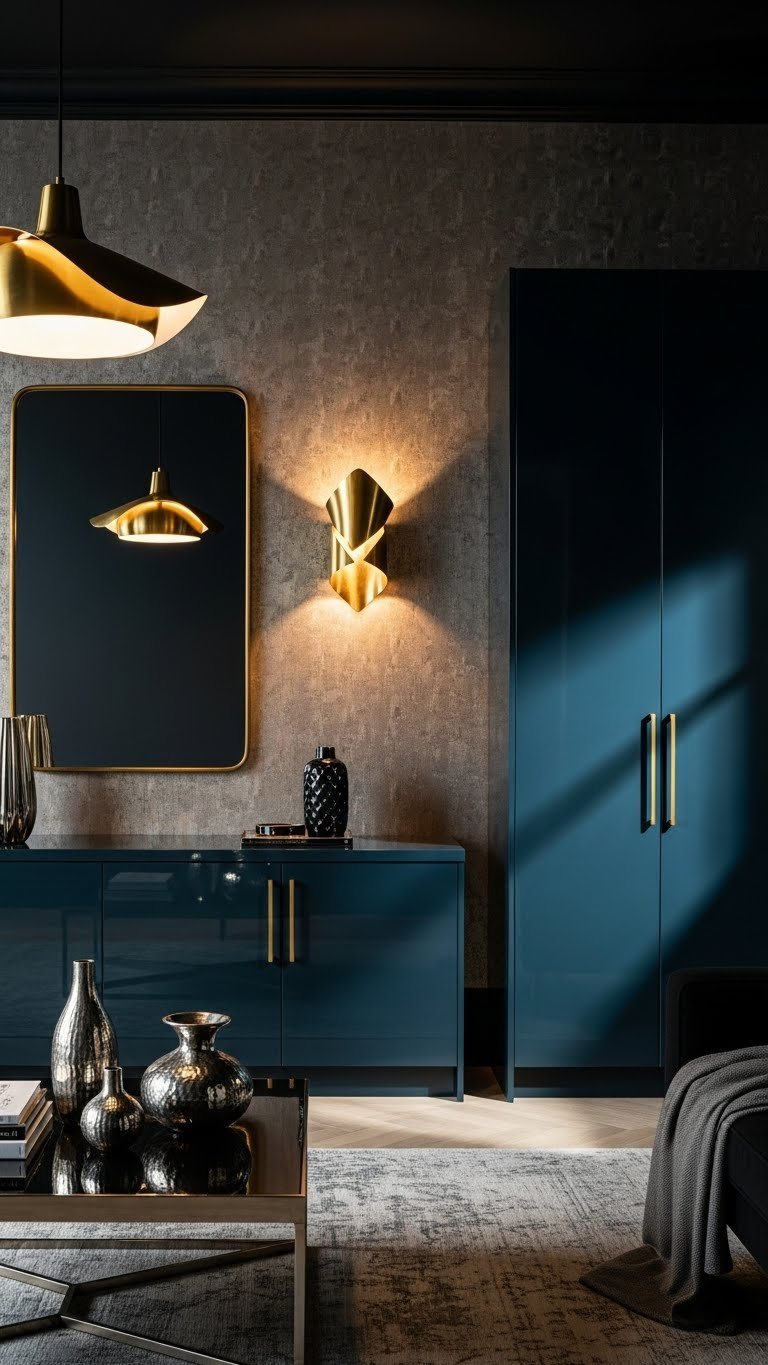 You’ll layer metallic wallpapers on an accent wall, add brass mirrors and sculptural lighting, and choose lacquered cabinetry to inject bold shine.