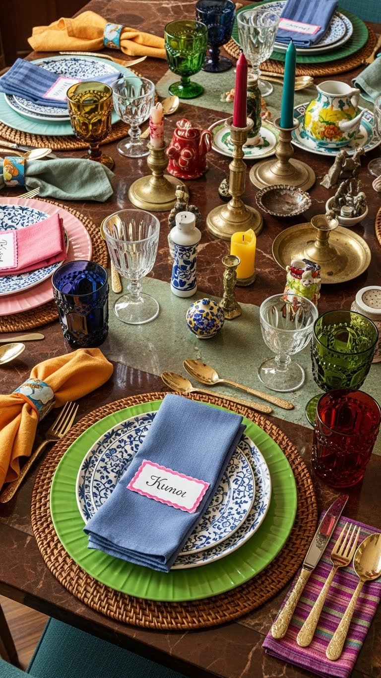 Mix bold patterns, varied textures, and unexpected heirlooms to create a dining tableau that feels curated rather than chaotic. You’ll layer Bold Chargers with patterned plates, woven placemats, and brass utensils for contrast. Add Mismatched Stemware, colorful napkins, and playful name cards so every seat reads like an intentional vignette. Trust instincts, break rules, and invite joyful conversation at your table.