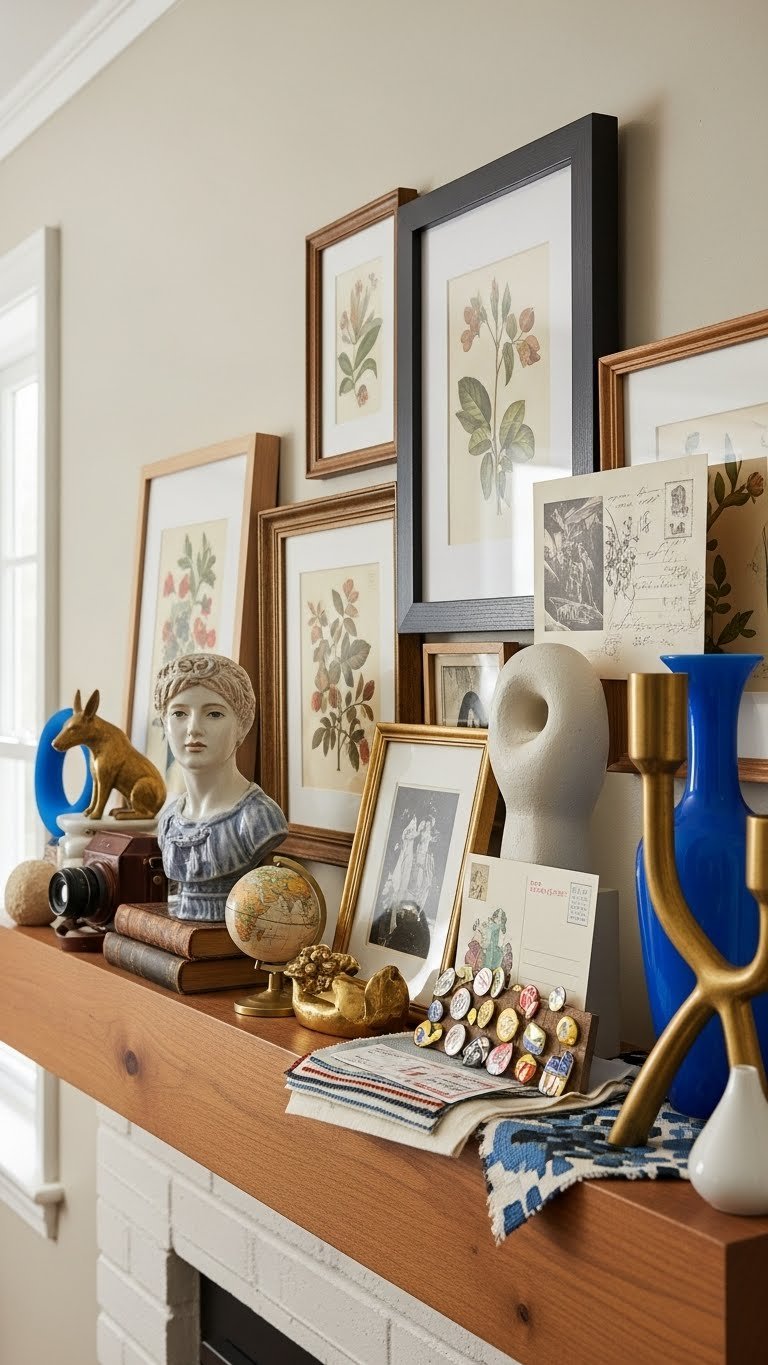 Lean into the mantel as your home’s stage and arrange a playful, highly personal collection that reads like a mini gallery—think unexpected pairings of small sculptures, framed ephemera, and a scattering of vintage finds.