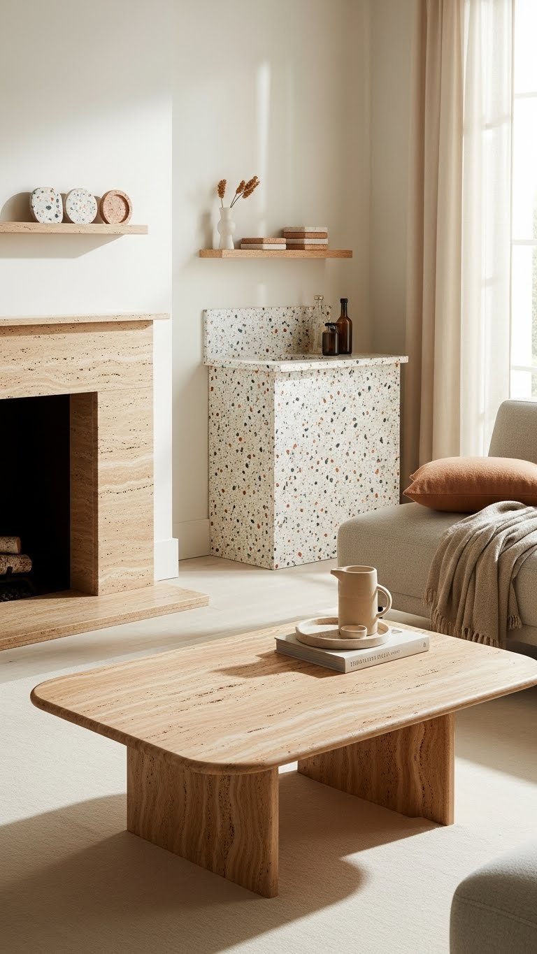 After you’ve layered soft textiles, let stone take the lead to anchor the room with enduring personality. Choose veined travertine for warm, sculptural surfaces—coffee tables, mantel surrounds, or floors that age beautifully.