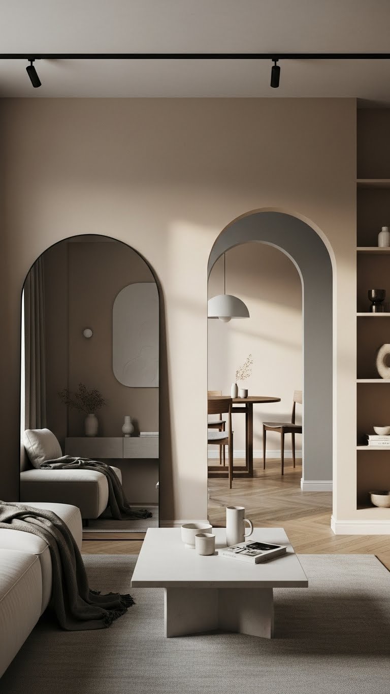 When you want to soften a room’s geometry without losing its contemporary edge, arched mirrors and doorways do the job with subtle confidence. You’ll choose arched frames to introduce gentle curves that echo minimal furnishings, creating flow and visual calm. Those softened thresholds invite movement between zones, make compact spaces feel liberated, and elevate a modern apartment with quiet, architectural charm.