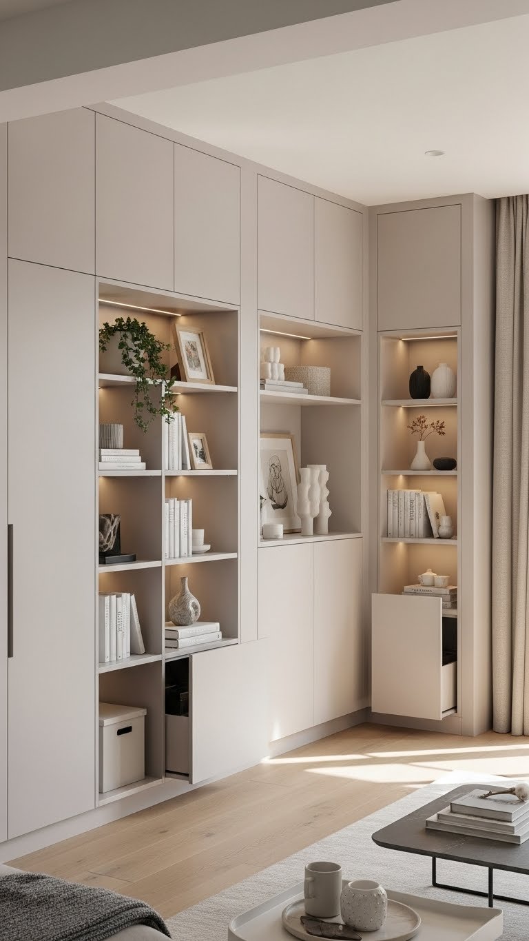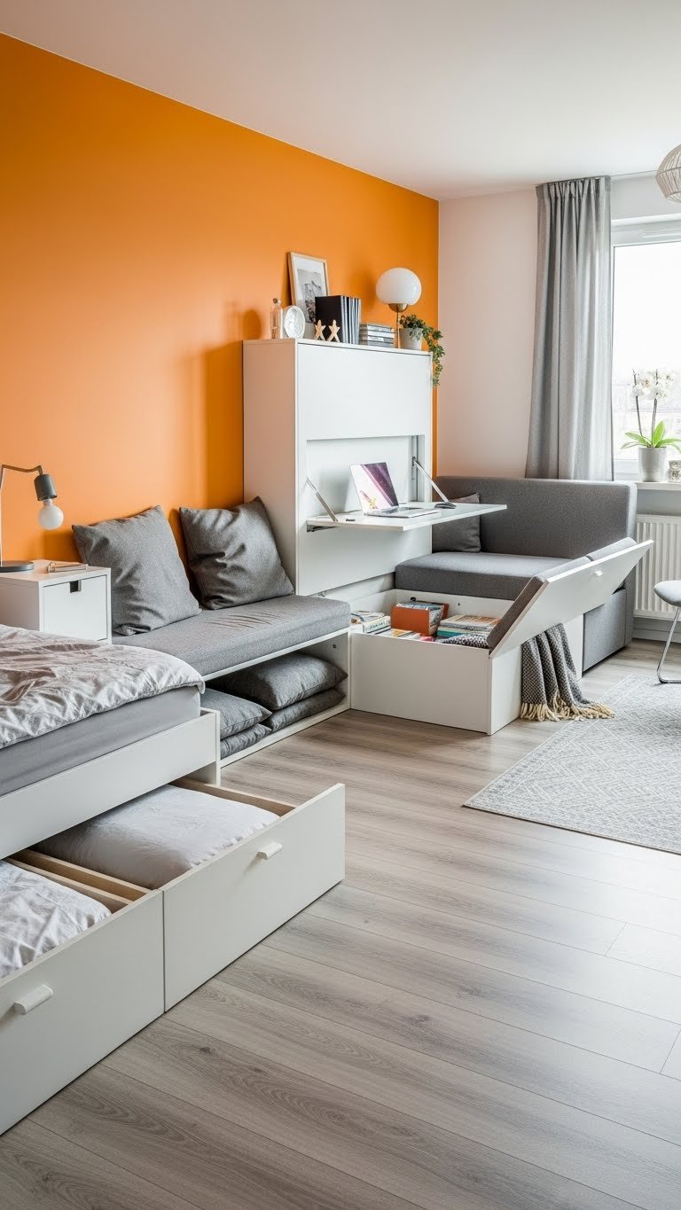 A bold accent wall sets the mood, but smart storage and convertible furniture make that mood livable—especially in apartments where every square foot matters. You’ll reclaim space with under bed drawers, built-in benches, and modular sofas that hide essentials. Choose fold down desks and wall-mounted consoles to create flexible zones. Clean lines and multipurpose pieces keep your home airy, practical, and free.