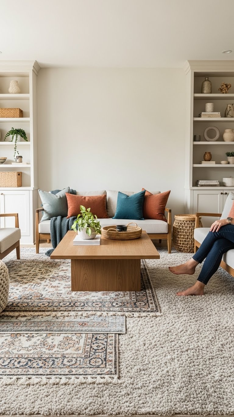 Built-in millwork creates the bones of a room; plush area rugs bring warmth and tactile definition to seating groups. You’ll choose rugs that invite barefoot comfort, use layered textures to add depth, and leverage color anchoring to define conversation zones. Pick durable fibers, scale rugs to furniture footprints, and let soft pile soften modern lines so your space feels liberated and intentional.