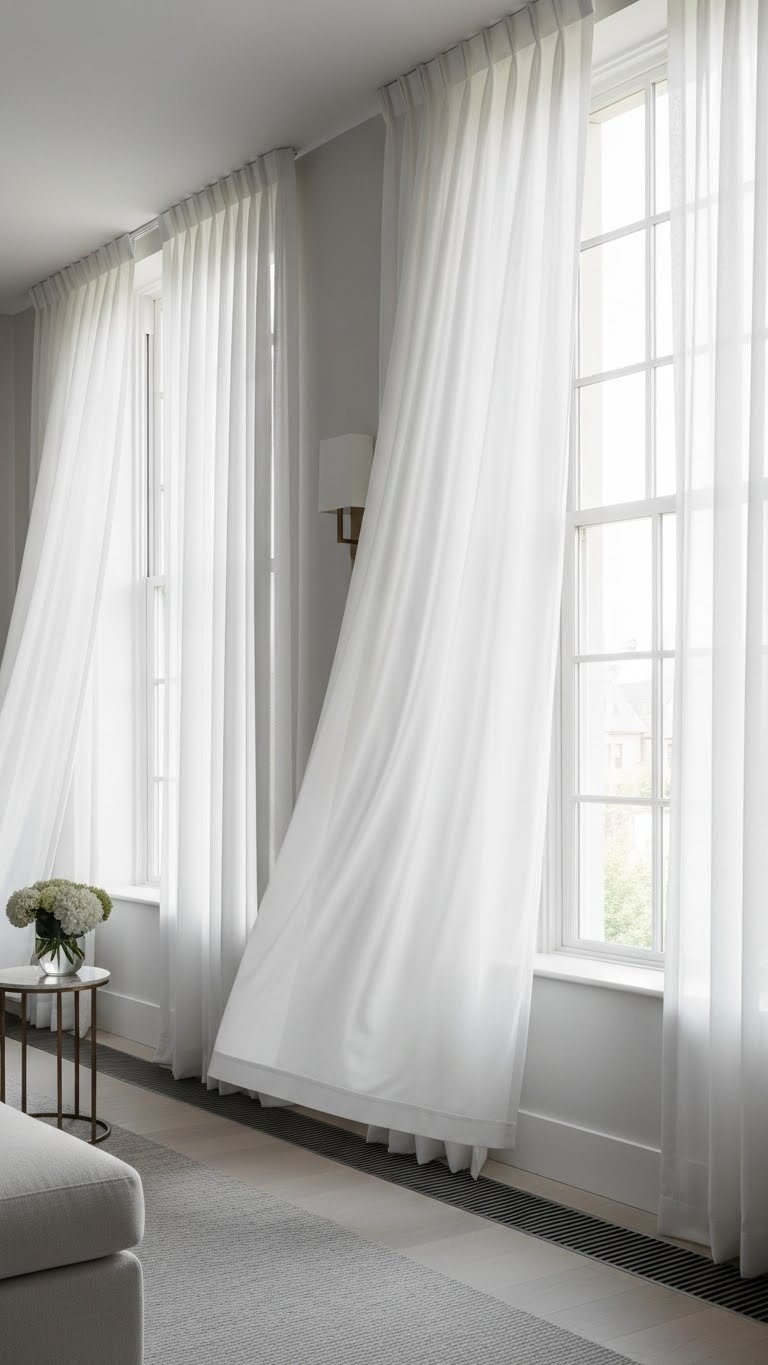 Let flowing pleats and airy panels soften your windows and lift a room’s mood while still keeping lines clean and modern. You’ll choose silk panels for their drape and subtle sheen, pairing them with corded hems to keep movement intentional. These treatments float, filter light, and create calm without clutter, giving you effortless elegance and the freedom to shape atmosphere with minimal fuss.