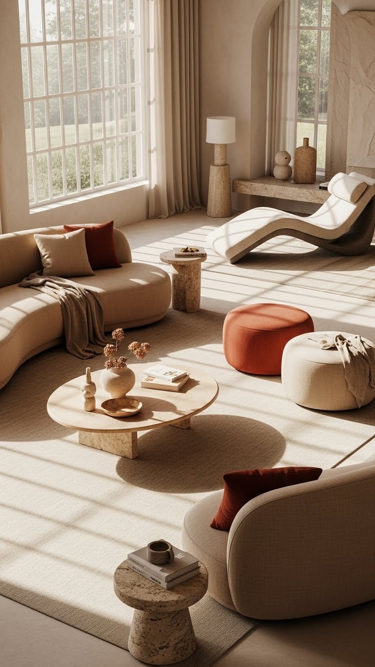 Curved silhouettes soften a room and invite you to sink in, turning rigid layouts into relaxed, flowing spaces that feel decidedly modern.