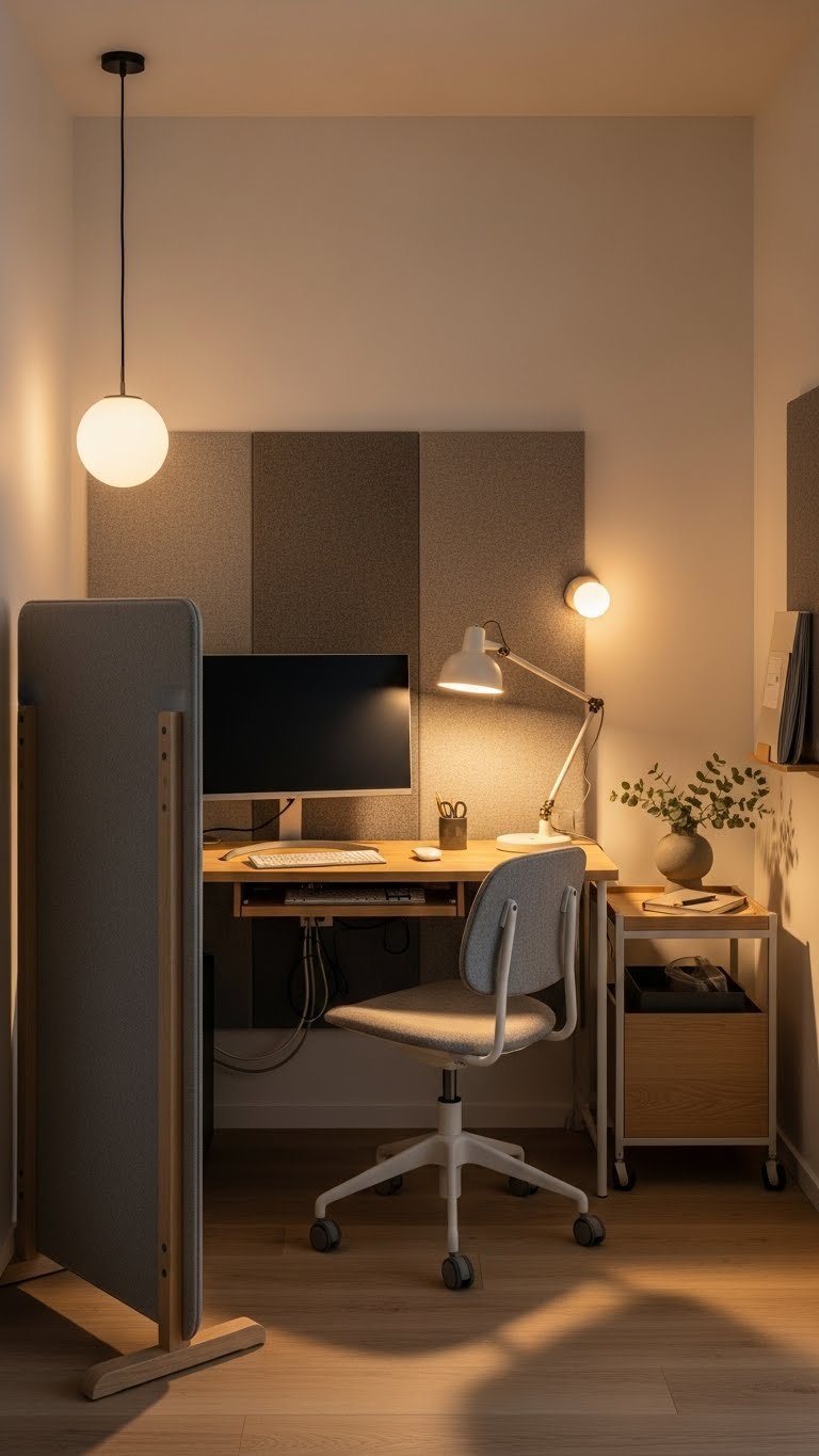 When you carve out a defined work nook, prioritize acoustic comfort as much as layout—soundproofing keeps focus intact and makes the space feel deliberately designed. Choose acoustic panels and a compact desk to maximize flow, add a privacy screen for visual seclusion, and use clever cable management to preserve clean lines. Keep finishes muted, lighting warm, and mobility effortless for true creative freedom.