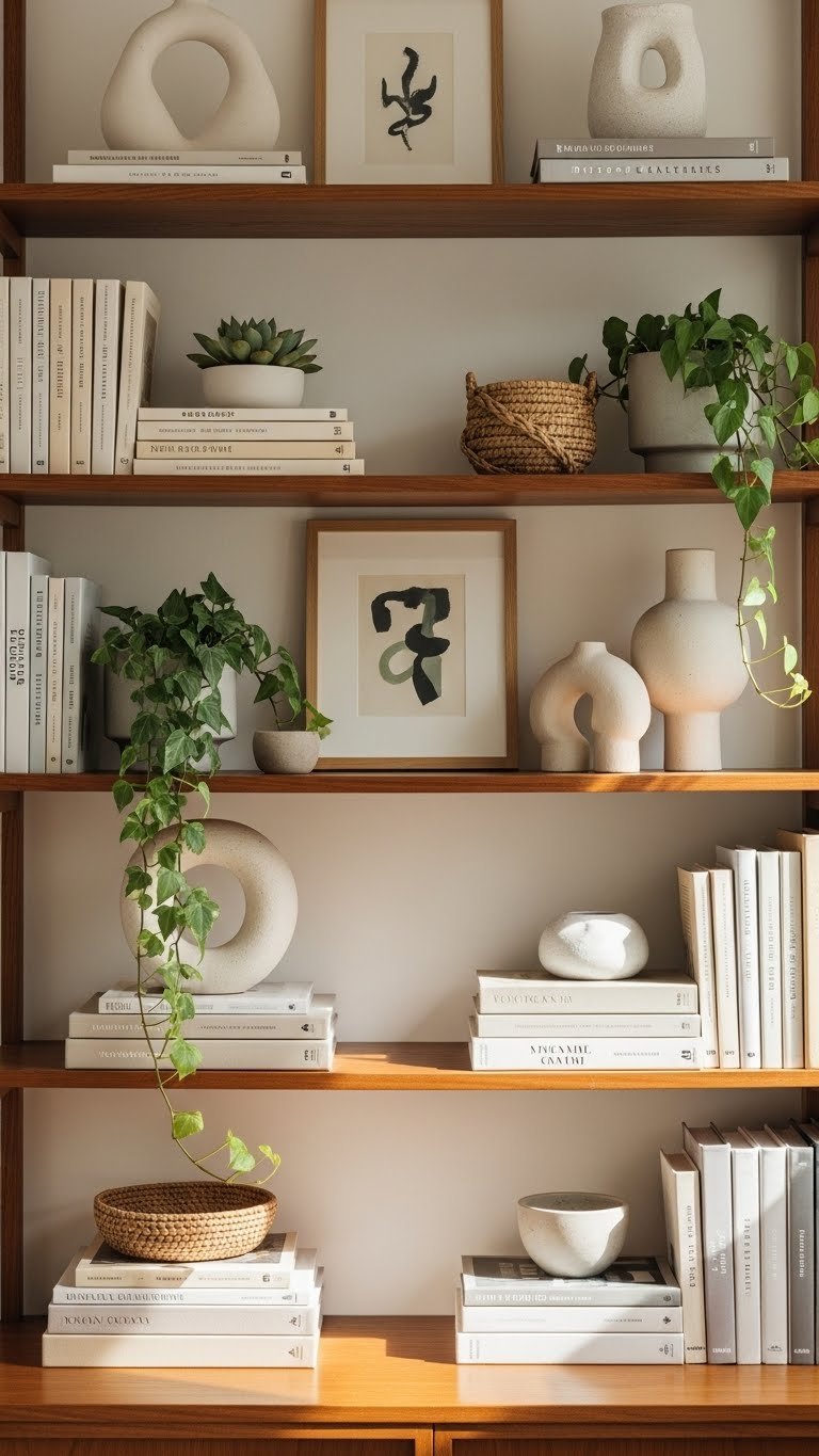 You’ll create curated stacks, alternating horizontal and vertical books, then punctuate with gallery vignettes and tactile pieces. Keep negative space, vary scale, and let each shelf breathe so your display feels liberated and purposeful.