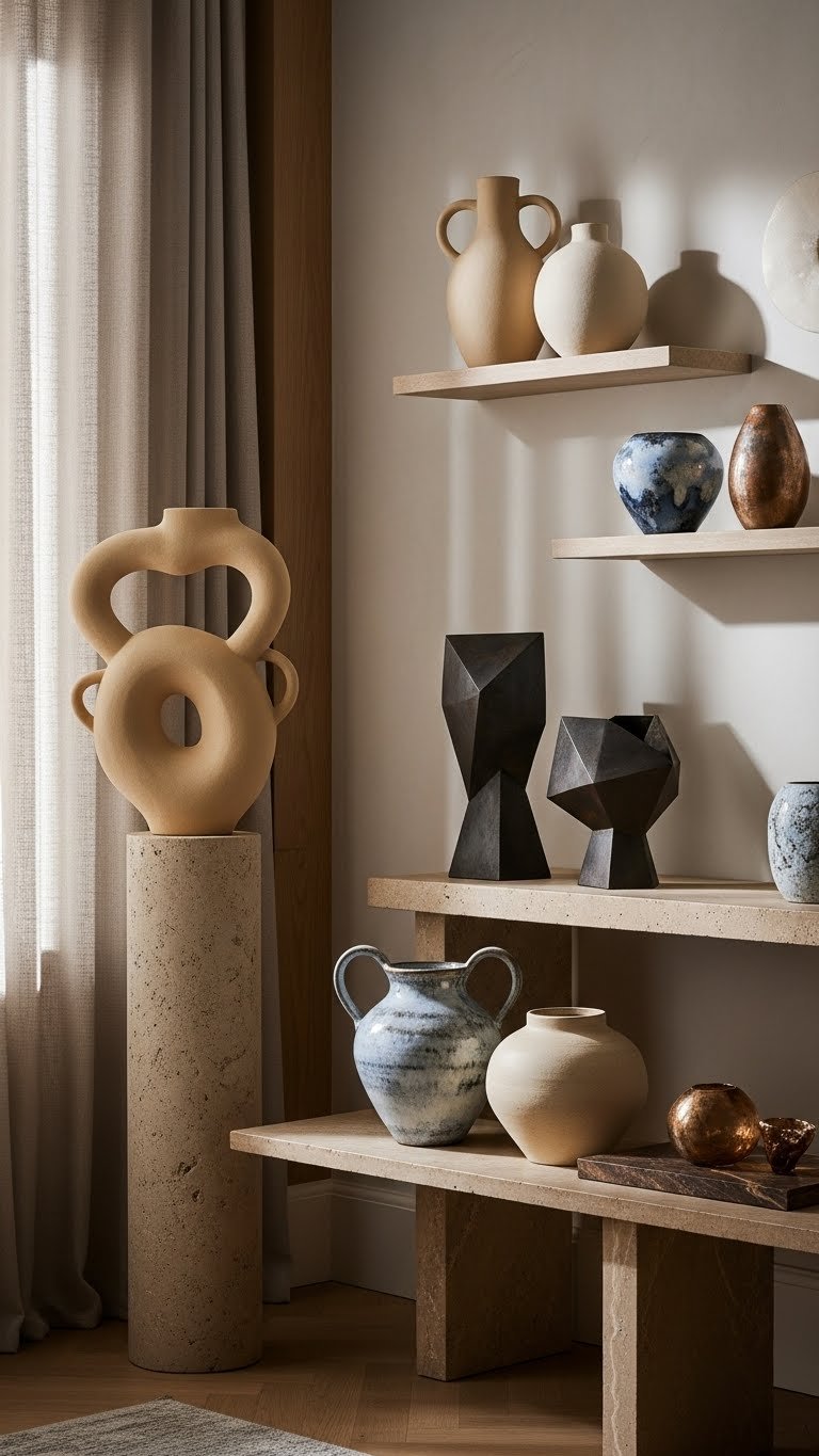 Sculptural pieces command attention and give your apartment an instant identity, so choose forms that speak to your aesthetic—organic ceramics for warmth, angular metalwork for edge, or blown glass for luminous softness. Place hand blown vases, patinated accents, and metal sculptures where they anchor a room. Favor geometric forms for rhythm, mix scales for freedom, and let one piece set the tone.