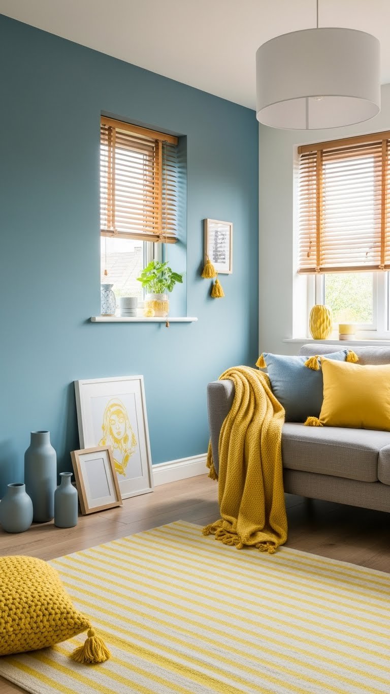 If you’ve set a calming blue wall as your anchor, sprinkle in creative yellow highlights to lift mood and quicken thinking without overpowering the room.