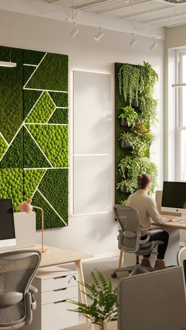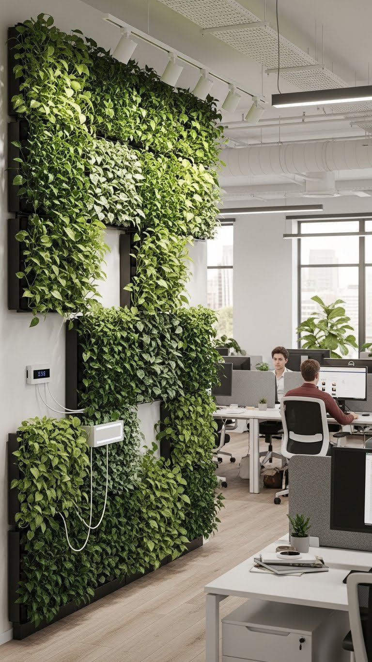 You’ll love biophilic mosaics that create artful patterns; sensor controlled irrigation keeps maintenance effortless. Install modular panels for freedom to rearrange, boosting focus and creativity without clutter.