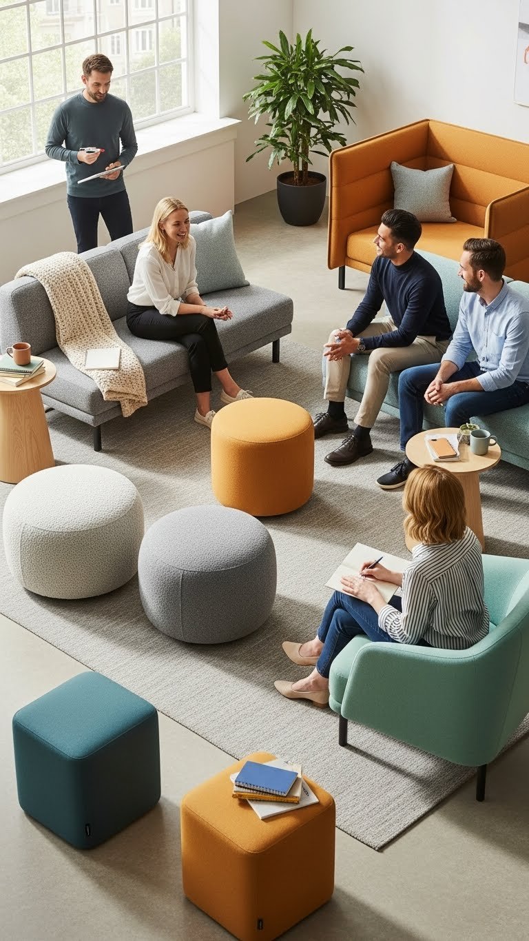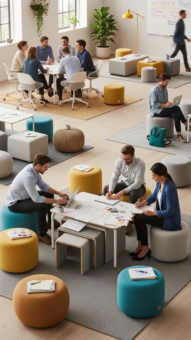 Add movable ottomans and floor poufs for tactile comfort, varied heights, and easy ownership of space—freedom to choose posture fuels creative momentum.