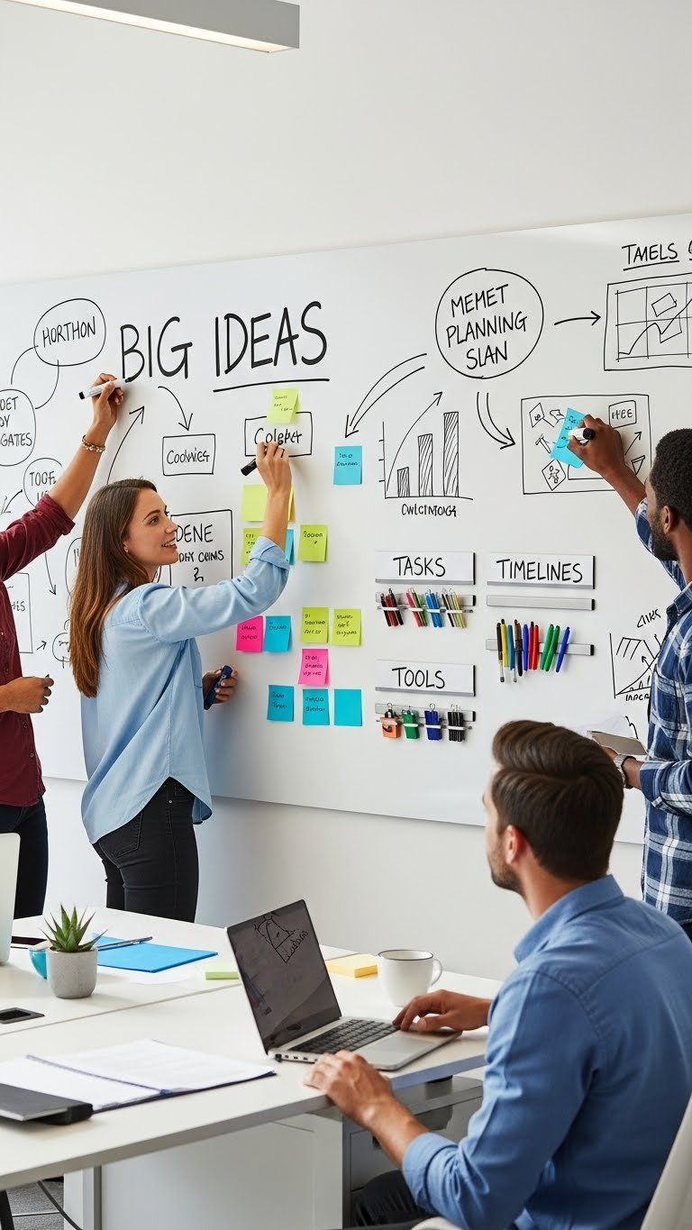 Embrace dry erase murals for bold visuals and easy edits, and use magnetic planning strips to anchor notes, tools, and timelines.