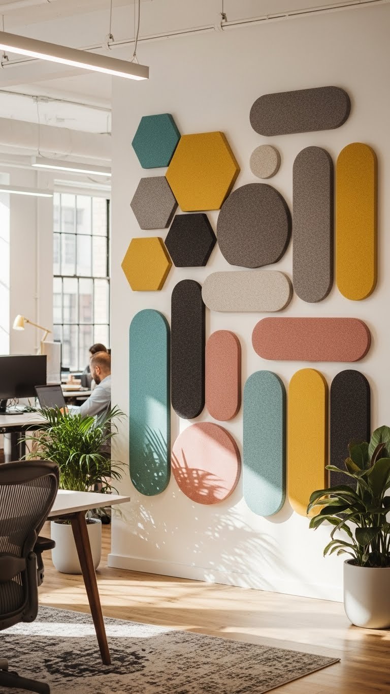 Give your office a sound upgrade that actually looks intentional — acoustic panels can cut noise and serve as striking wall art at the same time. You’ll pick modular sound sculpture pieces or soft textile canvases to shape mood and echo. Mount them in bold patterns, mix colors and textures, and reclaim focus. They’re functional, freeing, and effortlessly on-trend for a motivated workspace.