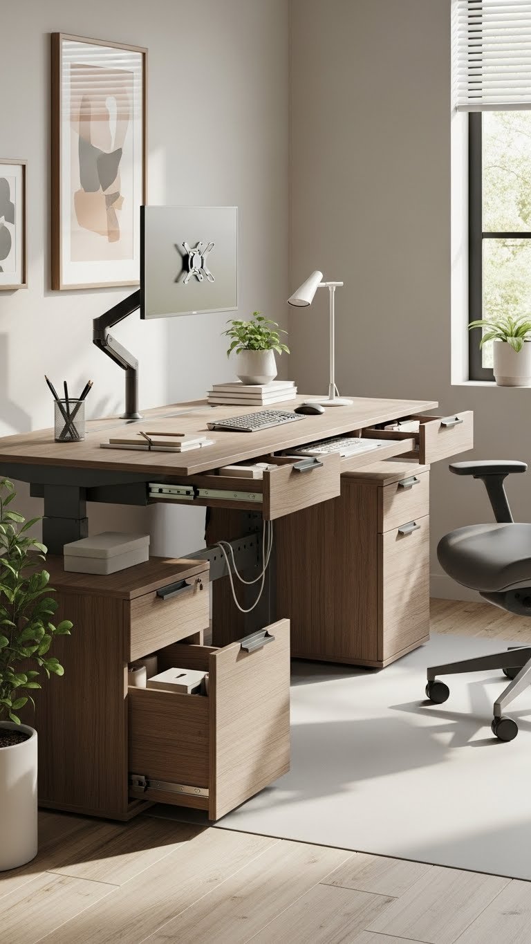 An ergonomic desk with built-in, stylish storage keeps your posture right and your clutter out of sight, blending form and function so work feels intentional and calm. You’ll pick adjustable height models with textured finishes, hidden drawers and smart cable management for freedom to move. Concealed cords maintain a clean silhouette, so your workspace stays sleek, efficient, and liberating.