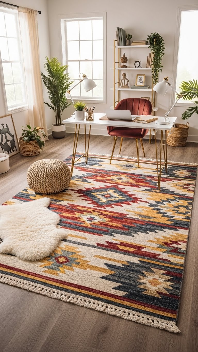 A bold rug can instantly anchor your office, defining work zones while injecting color and texture that lift the whole room.