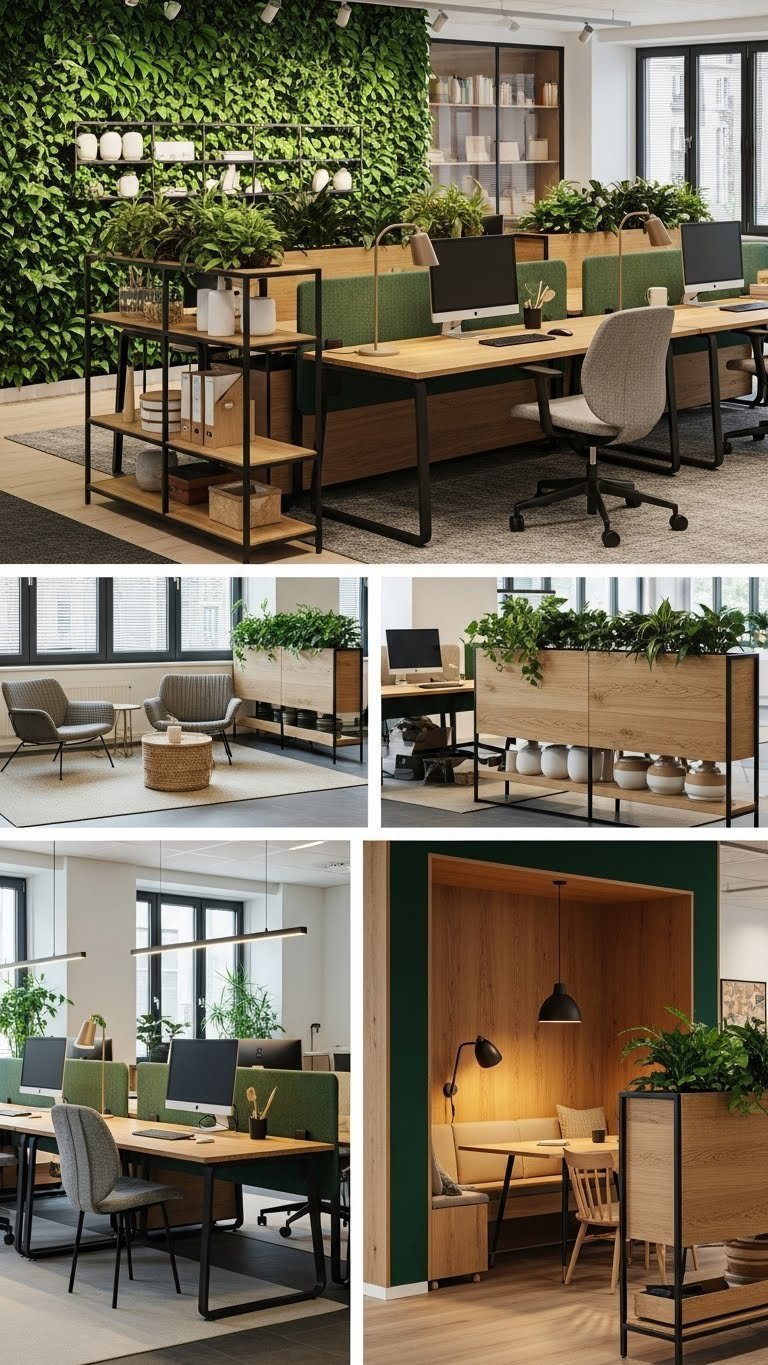 Bring the calm energy of your green wall down to human scale by introducing warm wood tones throughout the office; they pair beautifully with living plants and make spaces feel inviting without sacrificing modern polish.