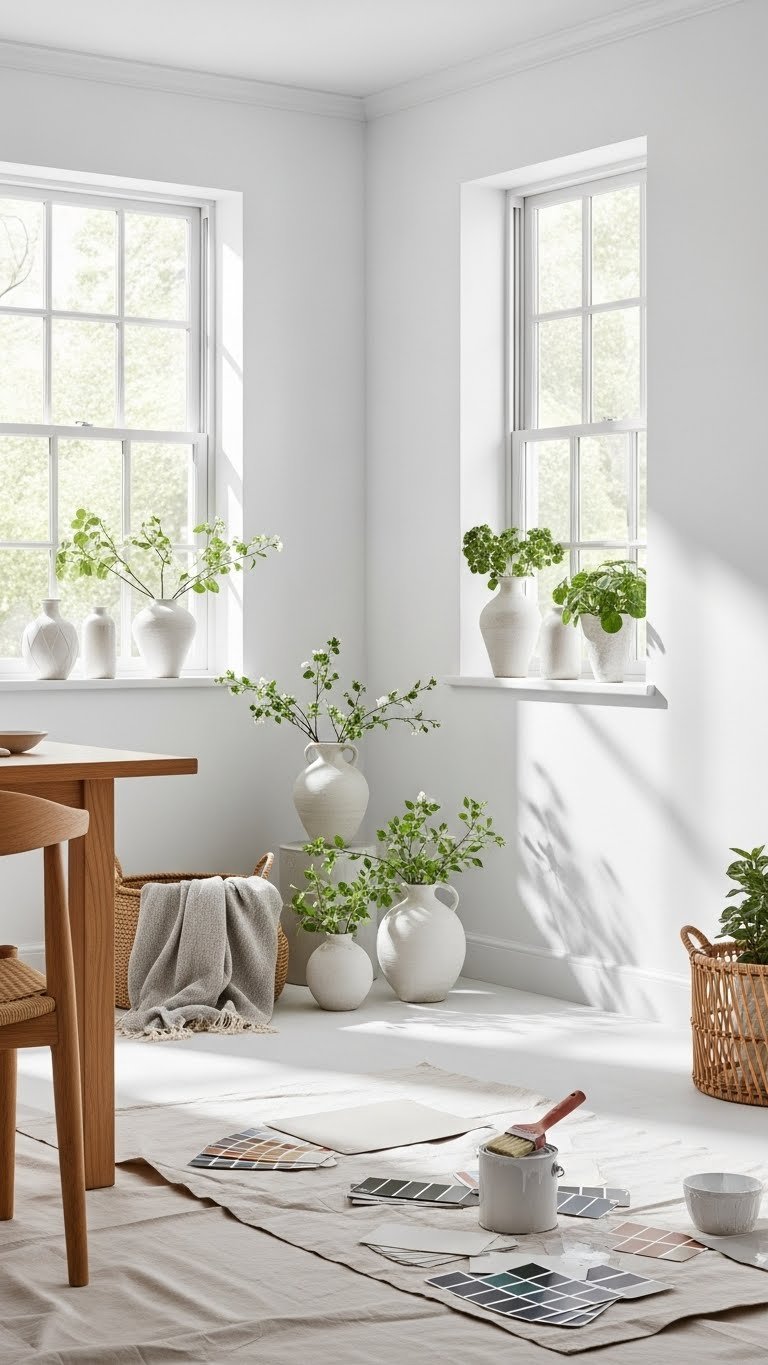 You’ll test paint samples in different lighting, trust a quality primer selection for smooth coverage, and let pale tones amplify textiles, ceramics, and plants.