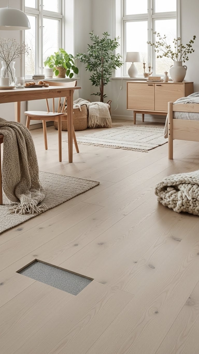 Opt for light-toned wood floors and furniture to instantly brighten a room and anchor that clean Scandinavian look—think pale oak, ash, or bleached maple with visible grain for inviting texture. You’ll choose engineered alternatives for durability and stable installation, pair planks with acoustic underlay to soften sound, and mix raw textures and minimalist profiles so your space feels airy, free, and tactile.