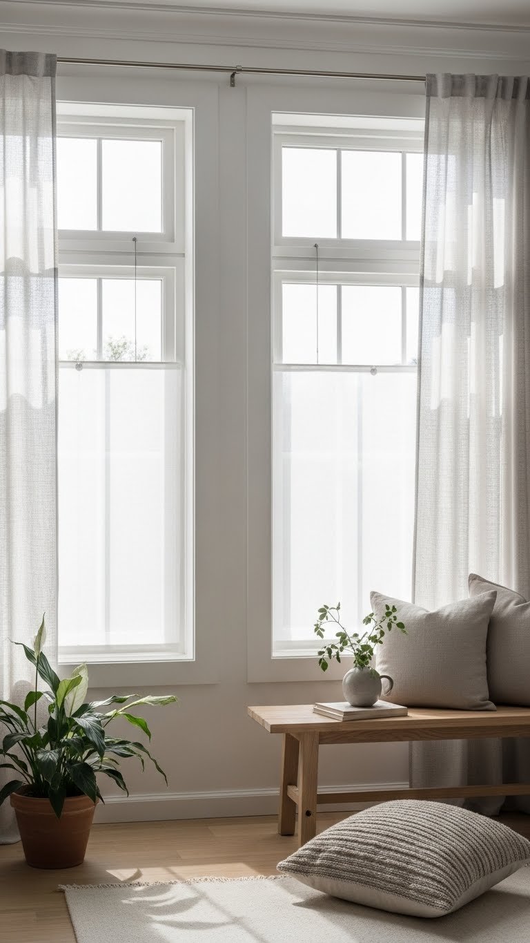 Although you want privacy, keep window treatments minimal and sheer to maintain that airy Scandinavian feel. You’ll choose lightweight linens or gauzy panels that filter light, opt for sheer cafe curtains at lower panes, and mount them on delicate tension rods. This keeps sightlines open, highlights texture, and lets you move freely—bright, breezy, and quietly refined without clutter or heavy fabric.