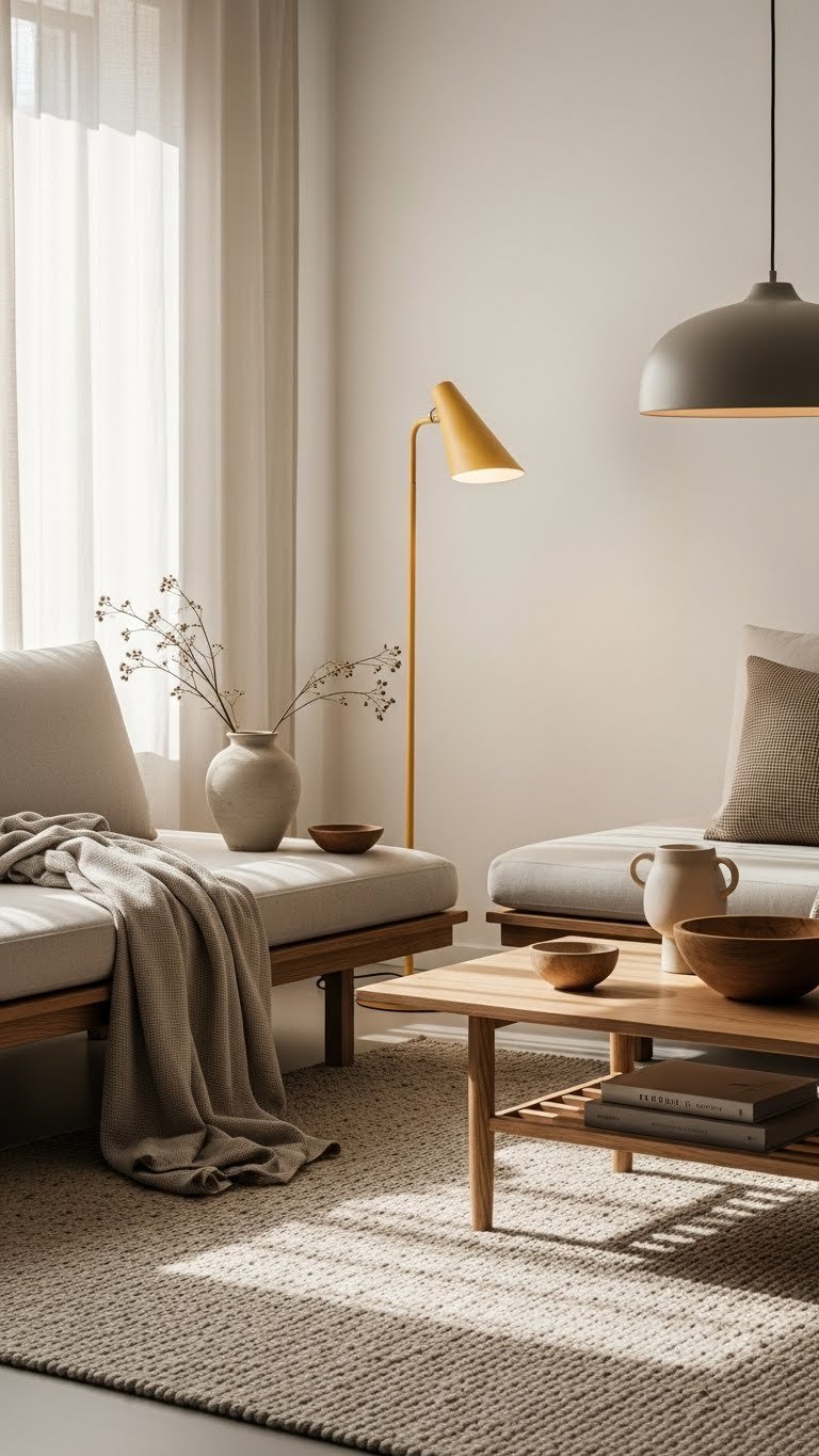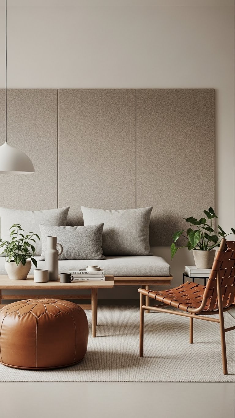 If you want to keep the palette calm but layered, introduce one or two muted accent colours and use them sparingly to reinforce texture and form. Choose muted teal or a hint of vintage mustard as anchors—small cushions, a throw, or a lamp. Let colour punctuate woven surfaces, ceramic tones, and wooden grain so the room feels open, curated, and free.