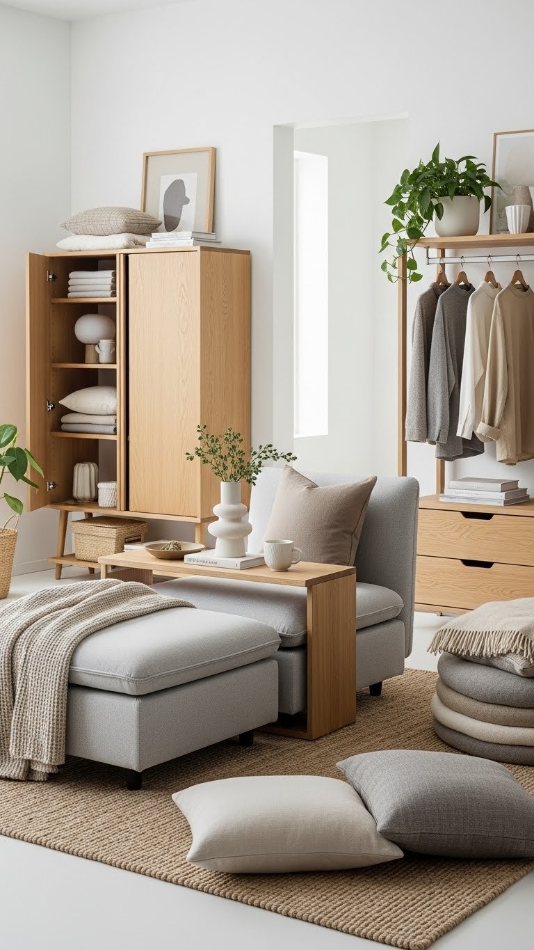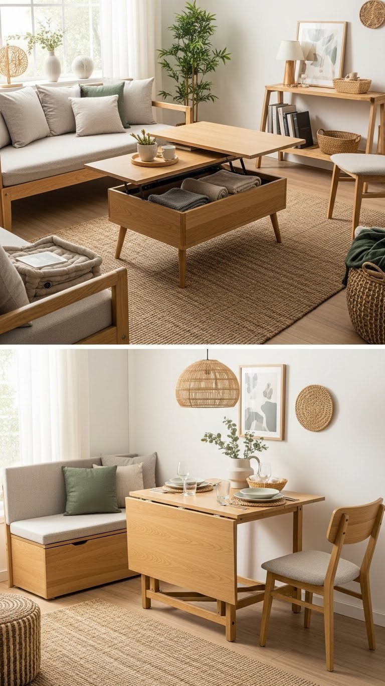 You’ll choose a convertible bench for seating and storage, add a folding table for flexible dining or work, and layer natural textures so functionality still feels warm and free.