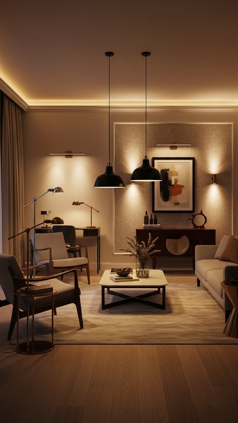 You’ll want to layer lighting to create depth and mood: start with soft ambient light to wash the room, add task fixtures where you read or work, and use focused accents to highlight texture and art. Embrace dimmable pendants for adjustable overhead drama, place layered sconces to frame seating, and mix directions and finishes so light sculpts surfaces and frees your space.