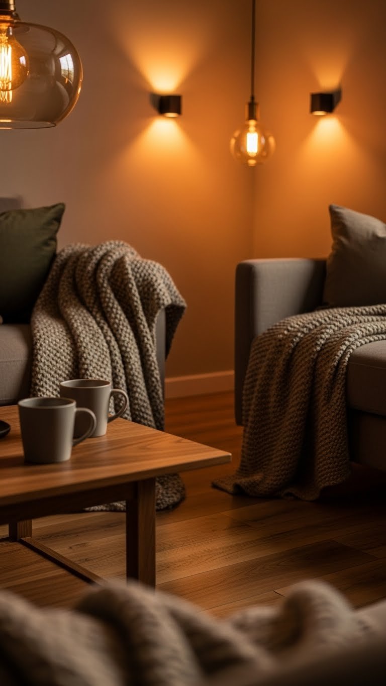 Frequently, swapping cool bulbs for warm ones instantly softens a room and brings that sought-after hygge glow. You’ll choose amber LEDs to flatter wood grain, wool throws, and matte ceramics, creating textured warmth.