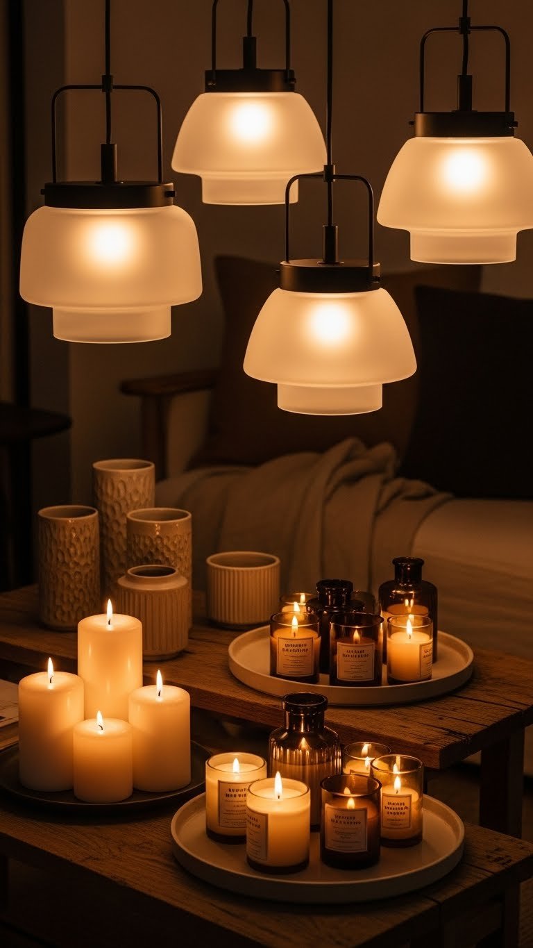 You’ll mix scented votives on trays, cluster pillar candles by low tables and install hanging lanterns for layered height. Choose matte metals, frosted glass and earthen textures to create soft shadows. It feels modern, liberated and tactile—lighting that invites slow evenings and personal rituals.