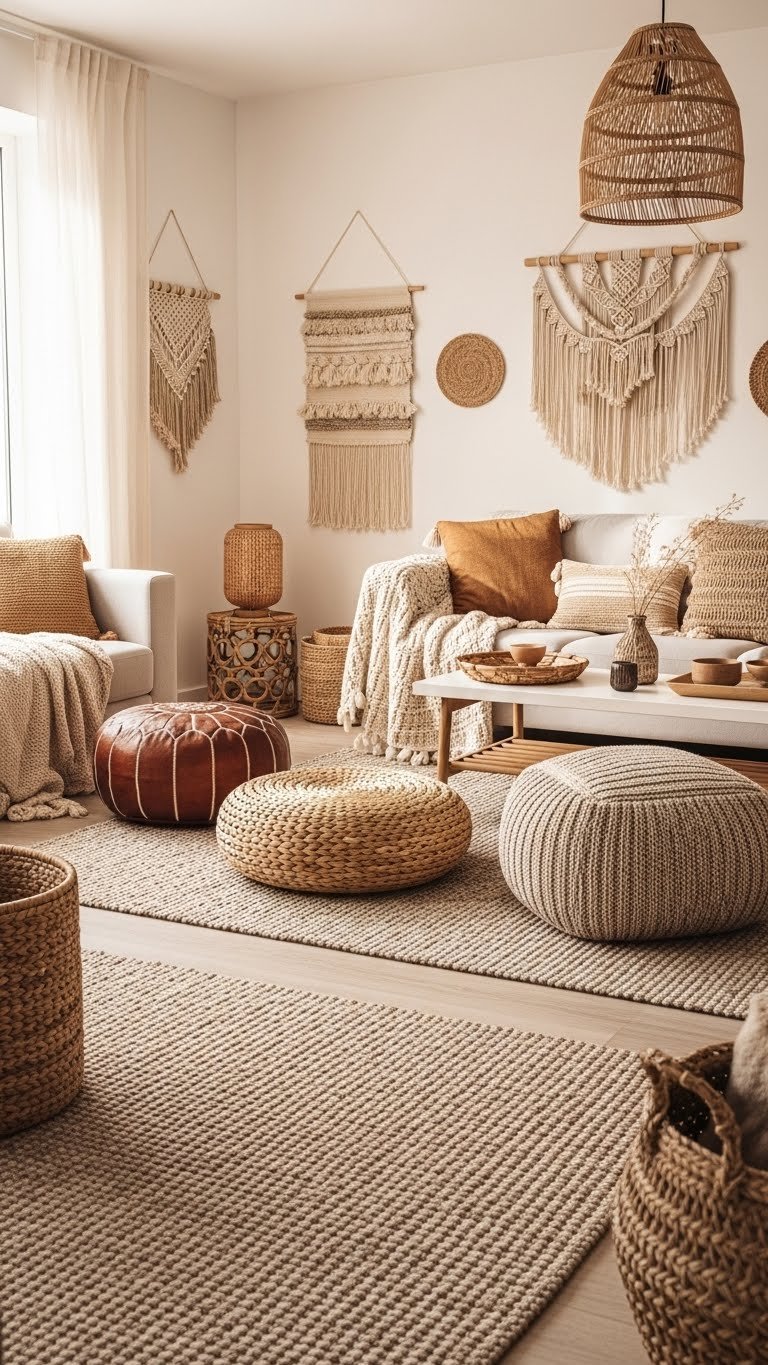 You’ve layered soft throws and cushions; now ground the room with textured rugs and woven accents that amplify that tactile story. Choose neutral, nubby rugs to anchor zones, add handwoven poufs for casual seating, and hang textured wallhangings to lift vertical space.