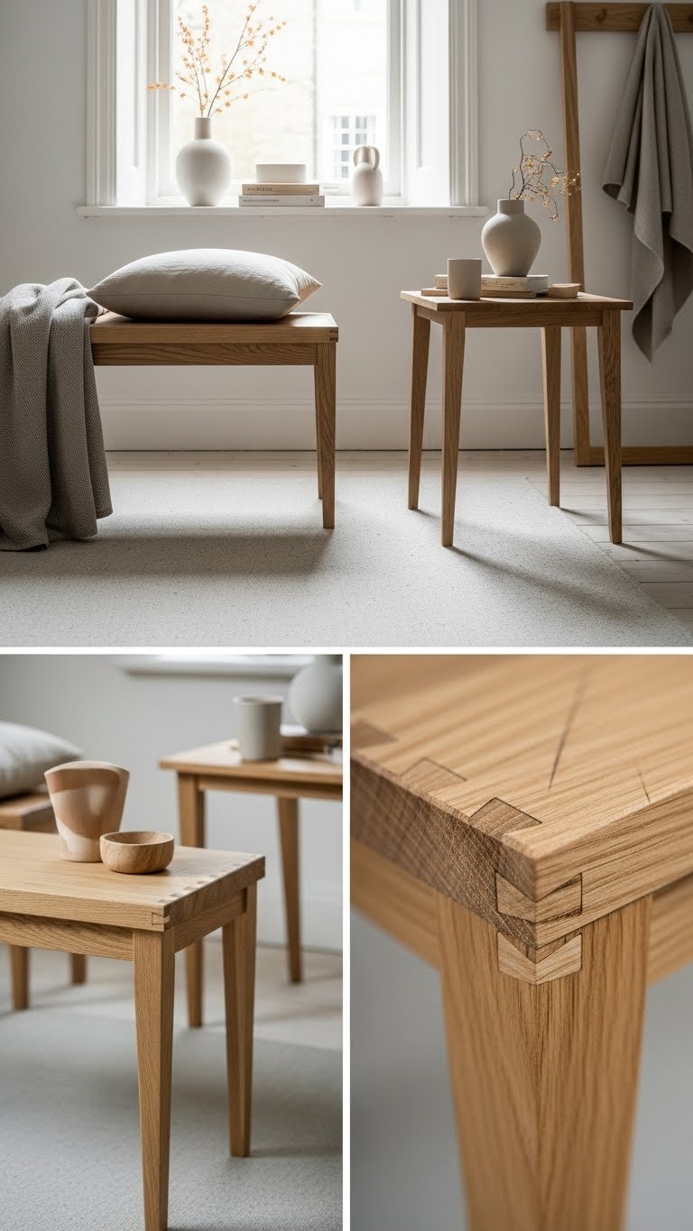 Bring in light wood joinery and handcrafted pieces to keep the room feeling airy and honest—think slim oak legs, visible dovetail joints, and hand-planed surfaces that celebrate texture and craft. You’ll choose pieces with hand cut dovetails and bespoke joinery, favoring simple profiles and tactile grain. Let honest construction and subtle imperfections free the space, grounding minimalism with warmth and personality.