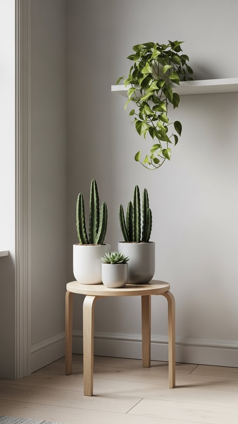 Choose low maintenance succulents in sculptural pots and a trailing, air purifying pothos on a shelf. You’ll enjoy tactile greenery, effortless care, and a liberated, breathable space that feels rooted yet uncluttered.